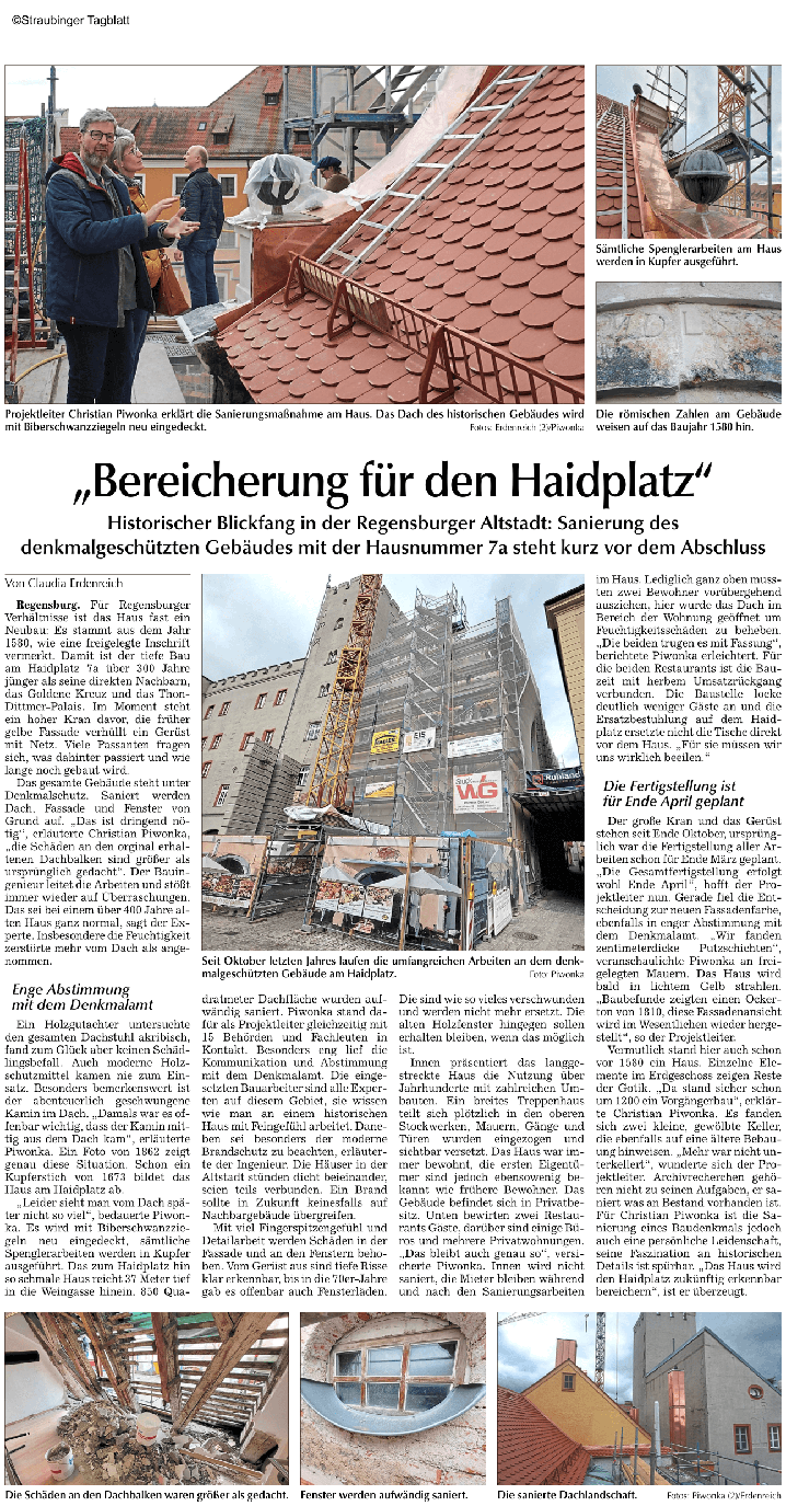 Das Gebäude, das fast 37 Meter tief bis in die Weingasse hineinreicht, wird nach Abschluss der Arbeiten in lichtem Gelb erstrahlen. Für uns ist es eine persönliche Leidenschaft, solche Baudenkmäler zu erhalten und mit unserer Arbeit dafür zu sorgen, dass der Haidplatz ein Stück seiner Geschichte zurückerhält.
